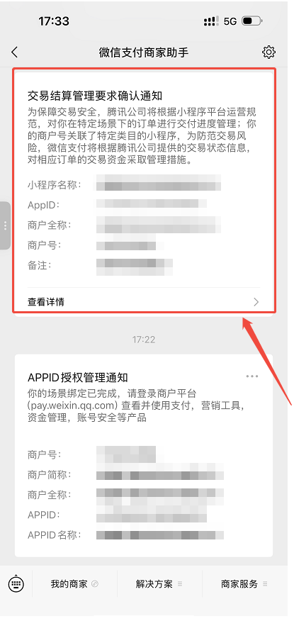 小程序超管微信号,搜索并关注“微信支付商家助手”服务号,点击对应通知,进行授权确认