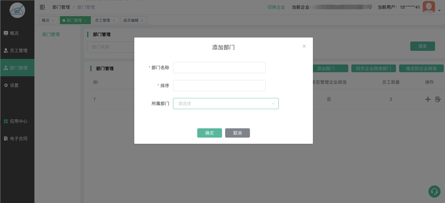 添加部门:部门名称、排序、所属部门