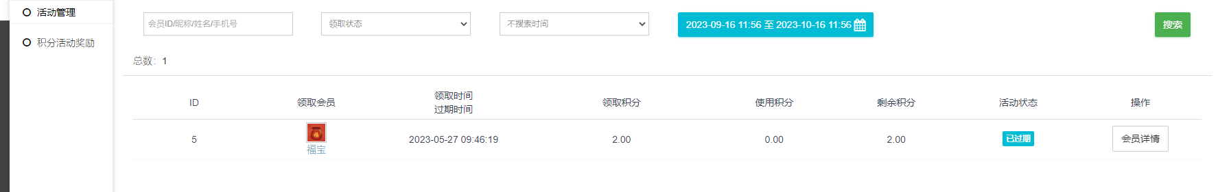 2,活动管理 会员创建的活动在这里显示,可以查看活动名称,粉丝,创建和结束时间,剩余积分等这些~